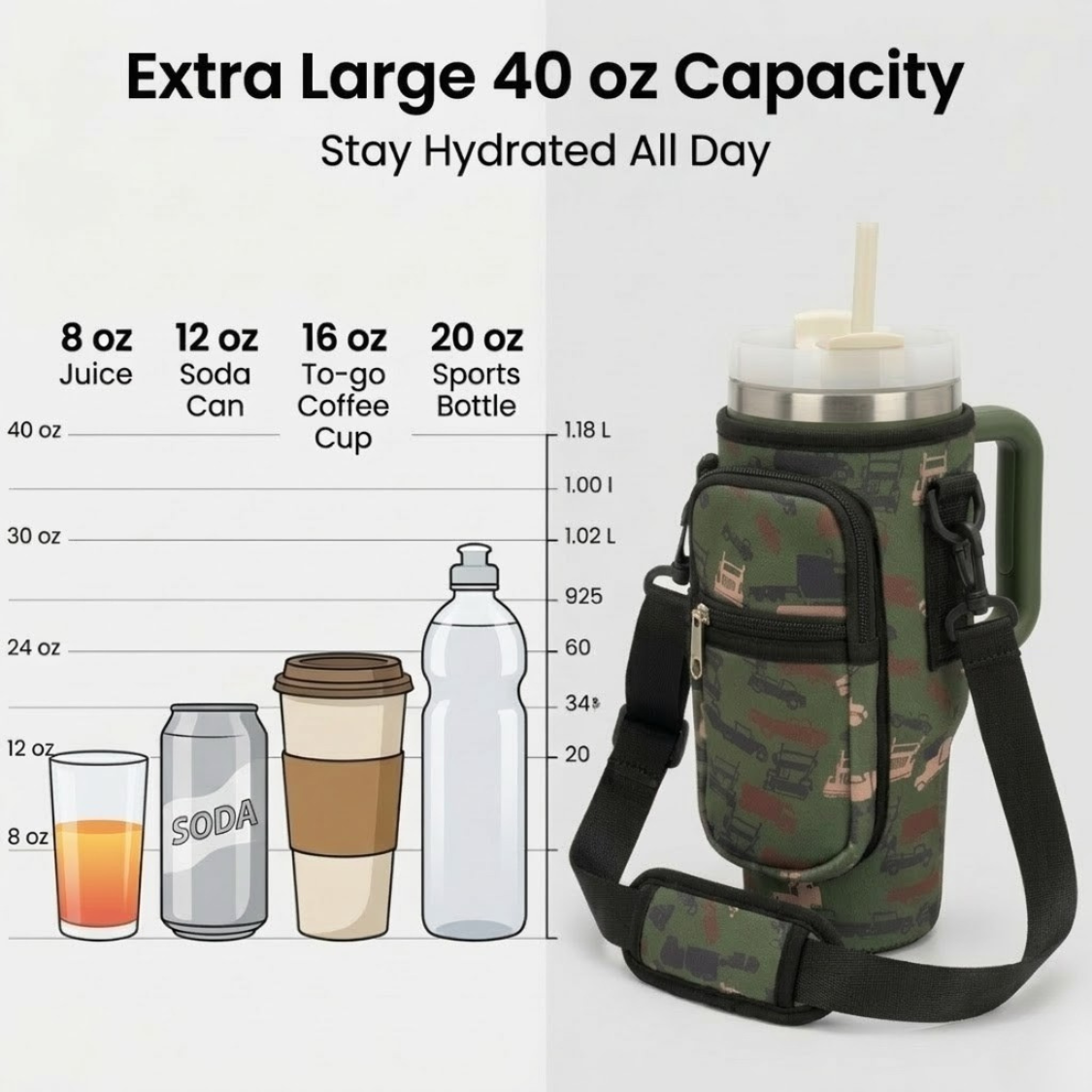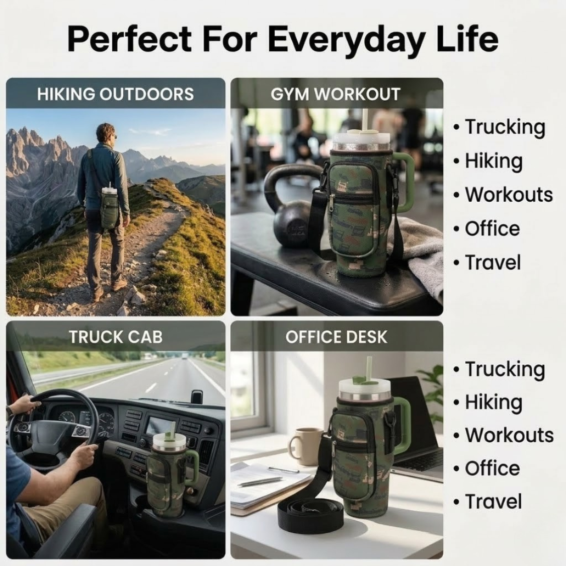 Each tumbler comes with a neoprene Trucker Camo Sleeve, designed for:
