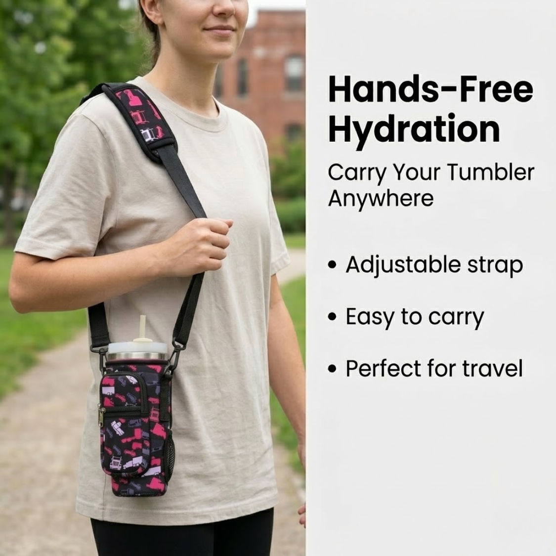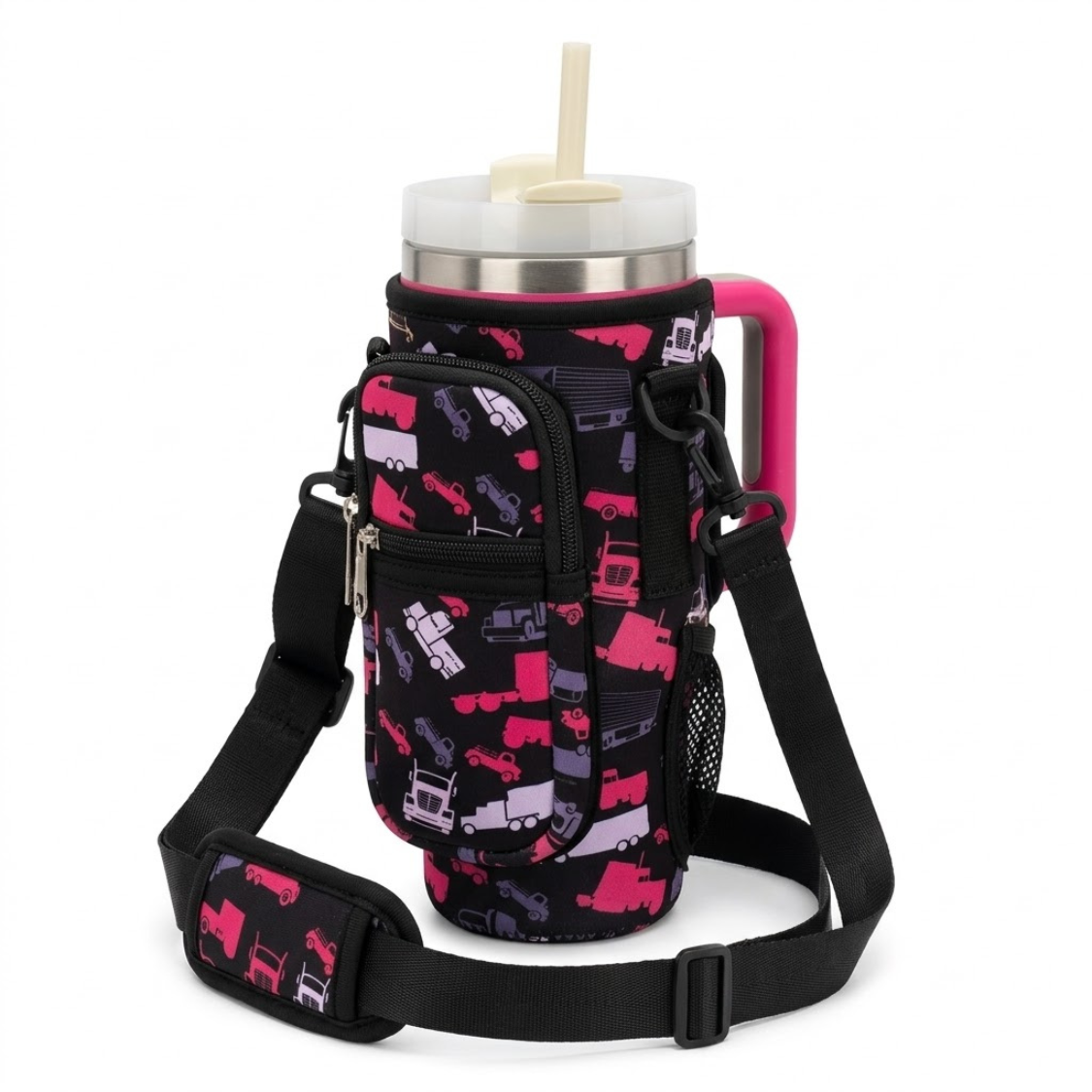 Stay hydrated on the road with the 40 oz insulated tumbler with handle, designed for truckers, travelers, and outdoor enthusiasts. This stainless steel travel mug features double-wall vacuum insulation to keep drinks hot or cold for hours. The Trucker Camo Neoprene Sleeve adds grip, reduces condensation, and protects against dents and scratches. Fits most cup holders—perfect for long hauls, commuting, or everyday use.